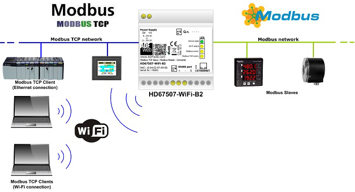 So, you can connect a "Master (Client)" Modbus TCP over WiFi with one or more "slaves" Modbus RTU in order to exchange information between the Modbus TCP Master and the Modbus slaves.