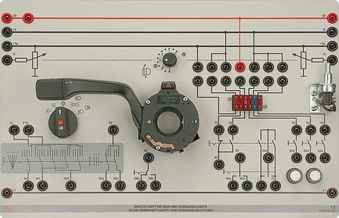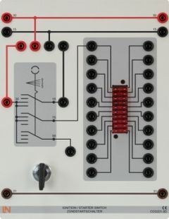Safety starter motor ignition switch with three switching levels and three positions to supply current to terminals 75, 15 and 50. 10 fuse plugs are included which can accommodate plug-in vehicle circuit breakers. The circuit breaker connectors can be tapped via 4-mm safety sockets and can clearly and easily be connected via space-saving jumpers to supply current to terminals 15 or 30. Power supply is laid out for improved educational effect at the top and bottom of the board and colour-coded in accordance with DIN72551.