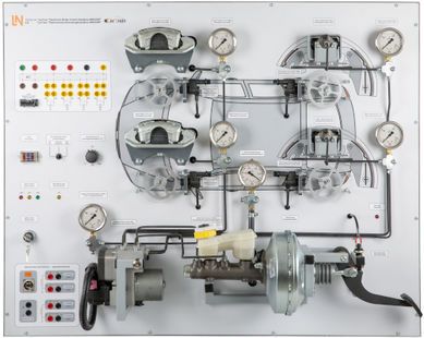 The training system consists of an original and complete braking system, which is equipped with disc brakes on the front axle and drum brakes on the rear axle. Thus both brake types are covered in one training system. The brake is actuated by means of a brake pedal, which is connected to the tandem brake cylinder via the brake booster. The brake lines are led from the mechatronic ABS hydraulic unit with ASR functionality to the individual brake calipers. In addition, the ABS control unit with ASR functionality evaluates the signals from the four original wheel speed sensors and regulates the brake pressure in the corresponding brake cylinders. The different pressures can be read off via the corresponding pressure gauges. Two separately driven sensor wheels make it possible to imitate different wheel speeds on the left and right sides of the vehicle.