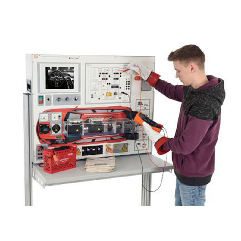 Trainees work directly on a real high-voltage system, which has nevertheless been adapted with special safety features so that it can be used without any prior qualifications. Thus this training system provides a safe work environment and allows students and trainees to fully focus on the task at hand. All the content is based on the world wide existing curriculums like DGUV 200-005 , IMI EV Qualifications or ASE L3. Trainees can become familiar with all the key theoretical background by means of an interactive e-learning course. Each of the theoretical sections is accompanied by practical exercises and tests of knowledge, which also help to advance vital diagnostic skills. These skills are further boosted by the built-in diagnostic system and the scrupulously selected fault scenarios. This is the only training system which gives students the opportunity to develop various diagnostic strategies involving measurements on an actual HV system with real HV voltages under the most stringent safety conditions.