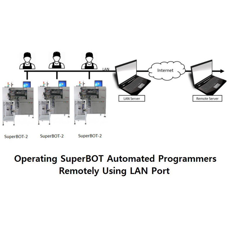 SuperBot 5x is an automatic IC programmer with Superior Performance at a affordable price for large-scale electronic product manufacturing. SuperBot 5x can automatically pick up, place, program, take out and pack up chips. With fully automated operation setup capabilities, it can improve working efficiency and minimize human errors. SuperBOT 5x comes with quad pick & place nozzles, 8 independent socket pressing actuators, two CCD cameras and can work with 2 tape feeders. Up to 2500 units per hour (UPH) for devices with programming time less than 50 sec. Suitable for both small and large capacity devices.