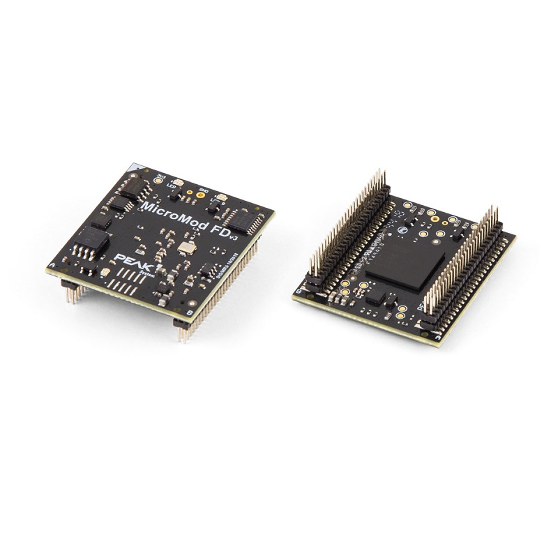 The PCAN-MicroMod FD is a small plug-in board with CAN and CAN FD connection on the one side and various physical inputs and outputs on the other side. The logical linking of both sides is done by the microcontroller NXP LPC54618. With the PCAN-MicroMod FD, electronics developers can easily integrate I/O functionality with CAN connection into their project